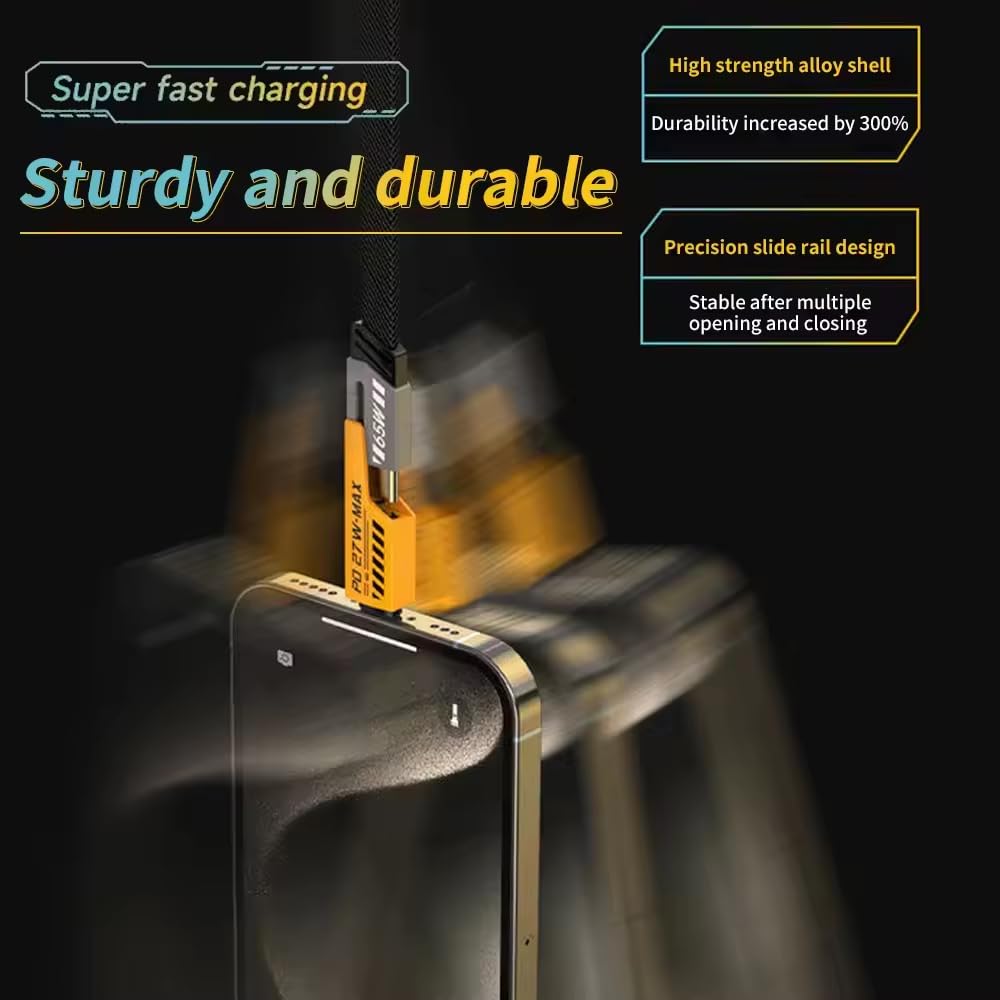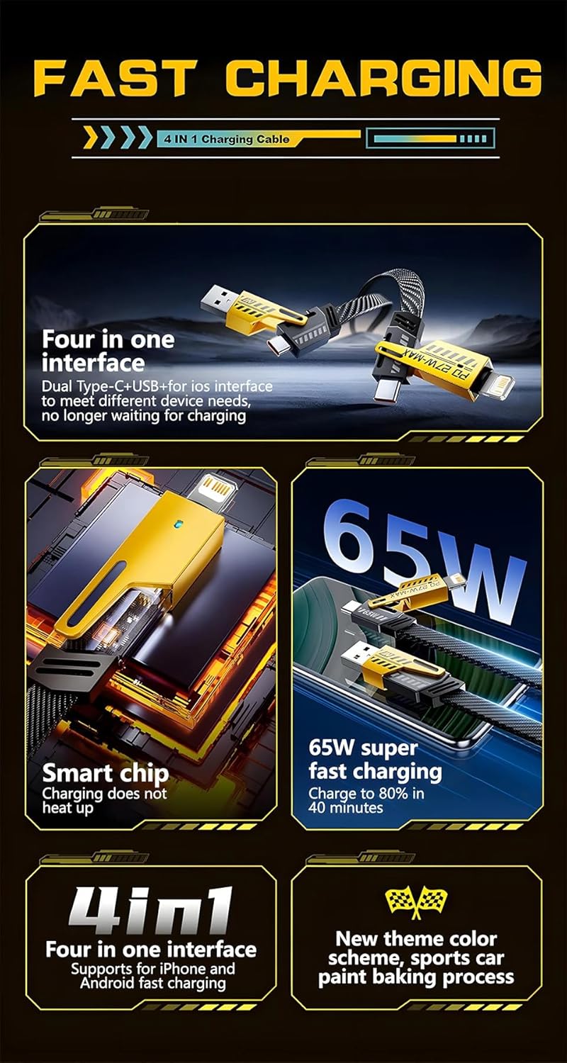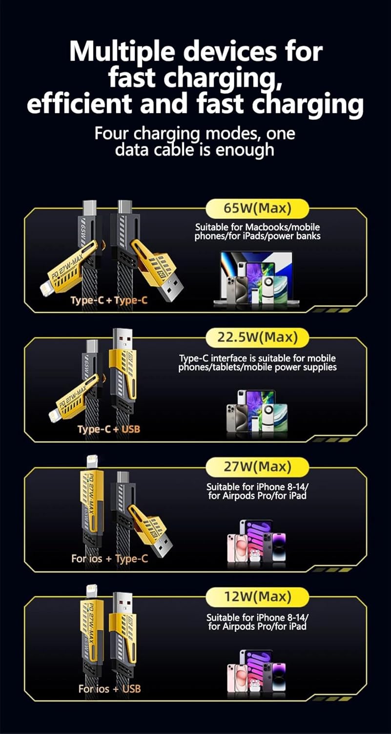 Product Description: Charge all your devices quickly and efficiently with the 65W 4-in-1 Fast Charging Cable. Designed for laptops, smartphones, tablets, and power banks, it delivers up to 65W of power to keep your gadgets running smoothly. The cable features USB-C, USB-A, Lightning, and Micro USB connectors, making it compatible with Android devices, iPhones, iPads, and other USB-powered devices.