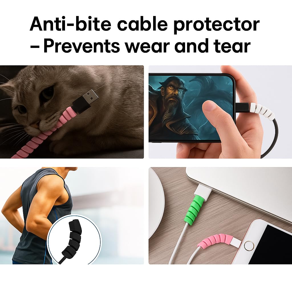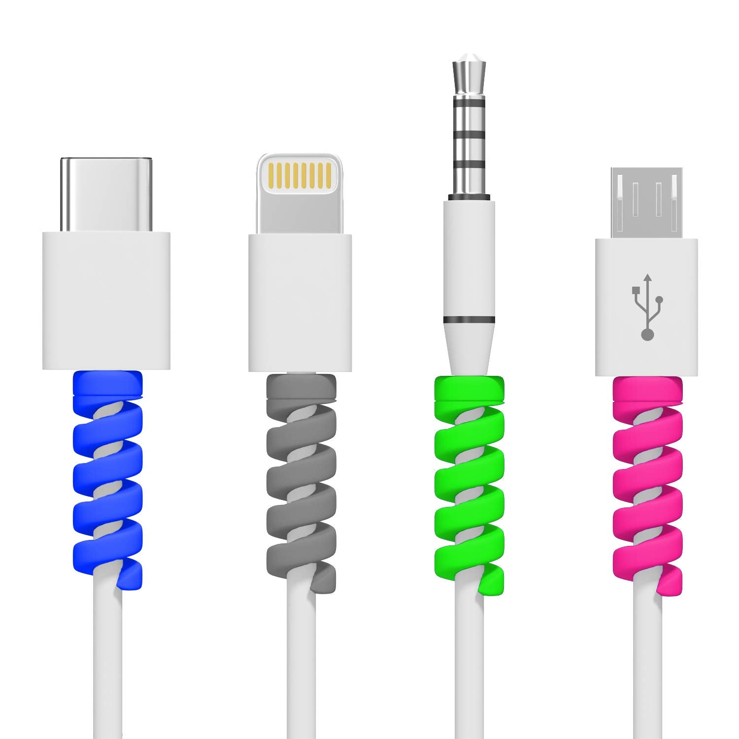 Twist Cable Protector Silicone Charger Cable Saver for USB Cables, Data Cables and Earphones – Set of 4 (Black, Blue, Pink, Green)